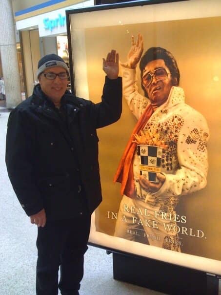 On the way back to Edmonton I stopped in to visit a friend in Regina. Ruth Smillie was artistic director of the Globe Theatre there. While waiting across the street in the mall for her to give me a tour, I high-fived this poster of a garish cartoon of Elvis hawking french fries no doubt without his knowledge. 10 minutes later Ruth asked me if I was interested in being musical director for a “juke box musical” with Elvis songs at a theatre in Prince George. It was called All Shook Up.